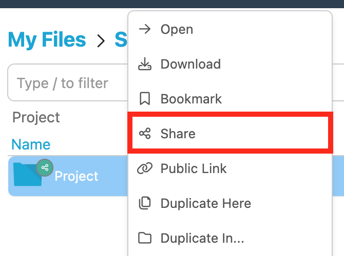 - Click the share icon on the right of the web app interface (alongside the folder name) or navigate into the folder and click the share icon at the top of the screen.