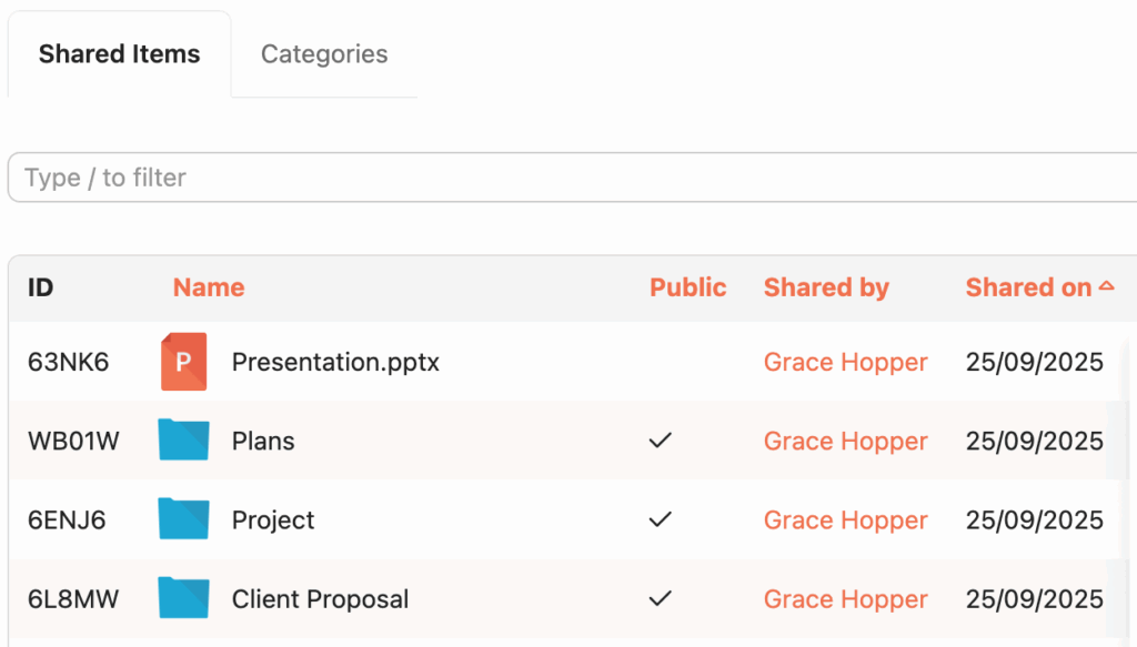 The Foldr administrator can create categories for use by users that are sharing content with others. Categories allow users to sort items that have been shared with them by type and allow for logical organisation of content that is available for me. A typical use in would be to create a category for each subject / project in an education environment.