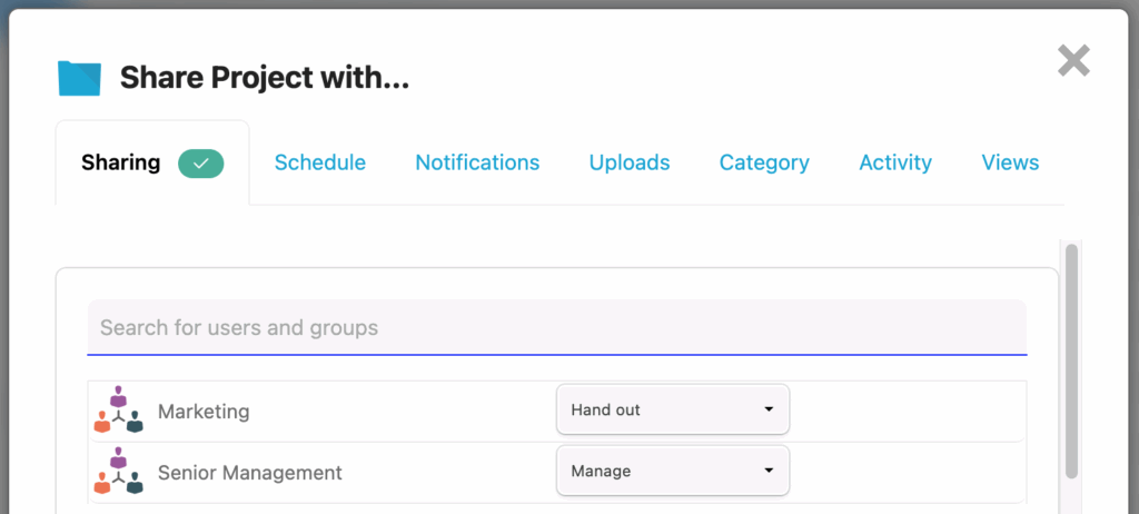 When a user shares a folder of resources with others inside the organisation, they can choose from one of four sharing modes / permissions.