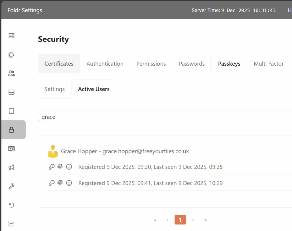 Foldr administrators can search for and view/remove user’s registered security keys in Foldr Settings > Security > Passkeys > Active Users.