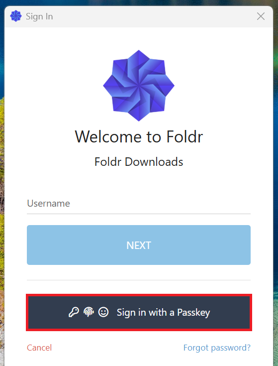 Signing in with a passkey is supported in the Foldr web and Windows desktop app. macOS users can use passkeys in the Foldr web app only. The iOS and Android mobile apps do not support passkey sign in.