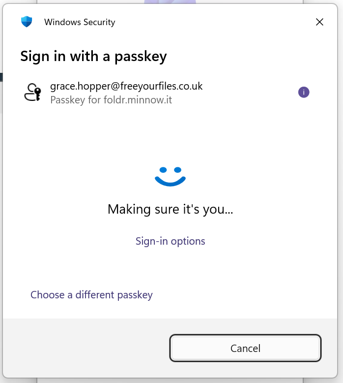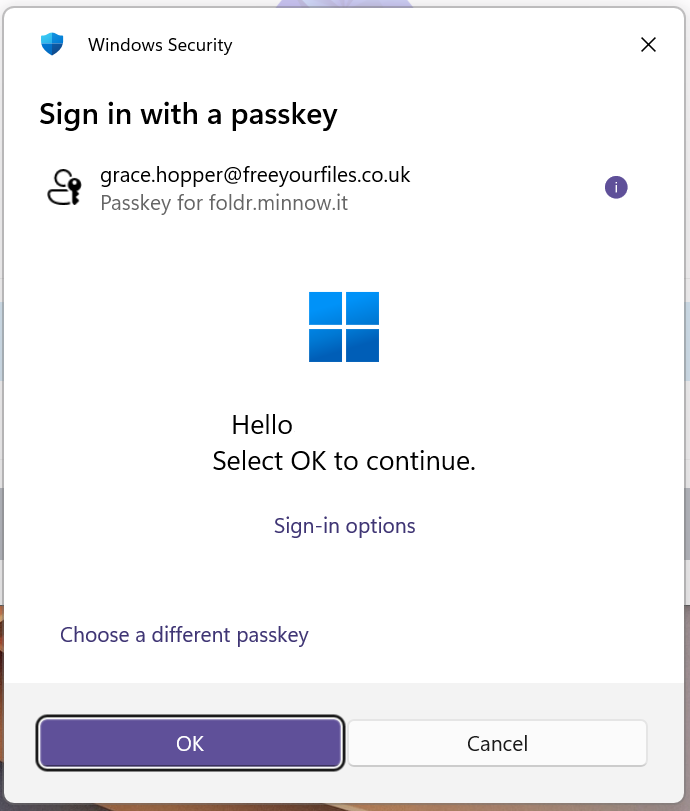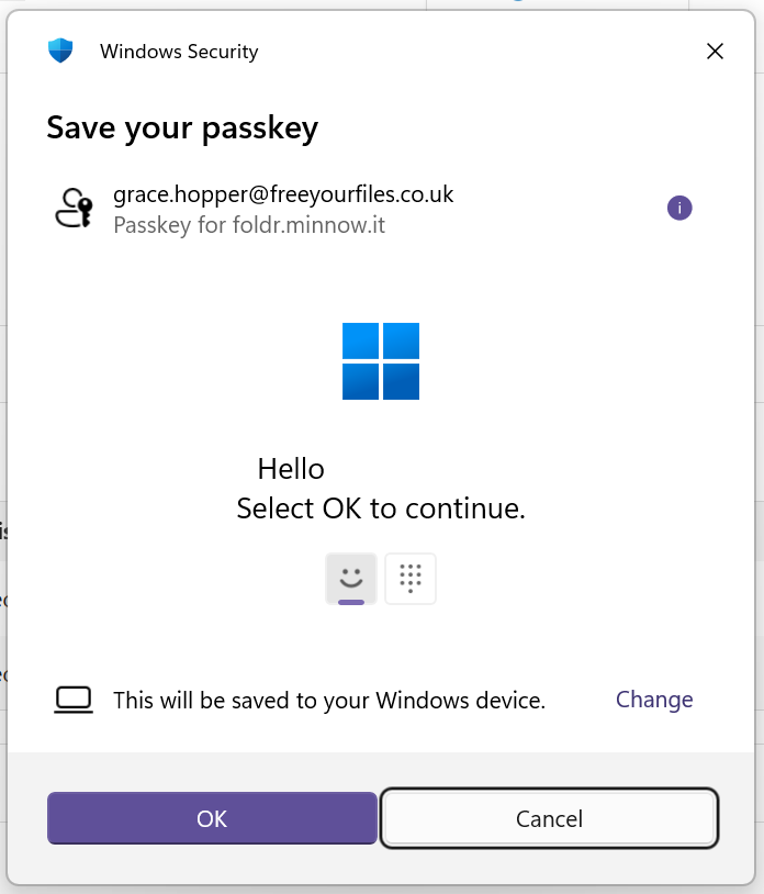 In the example below, a device has already been registered for passkey sign-in and will use Windows Hello (face scan) to sign into the Foldr app.