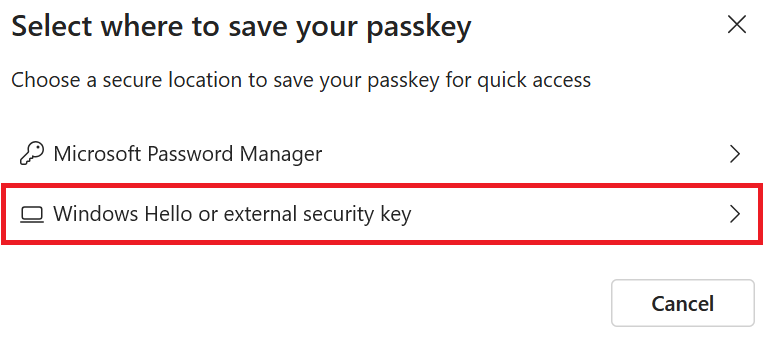 The select where to save your passkey dialog is shown, the user can either create a passkey which is saved in Windows Password Manager or choose ‘Windows Hello or external security key’ depending on preference. In this example we will choose the bottom option.