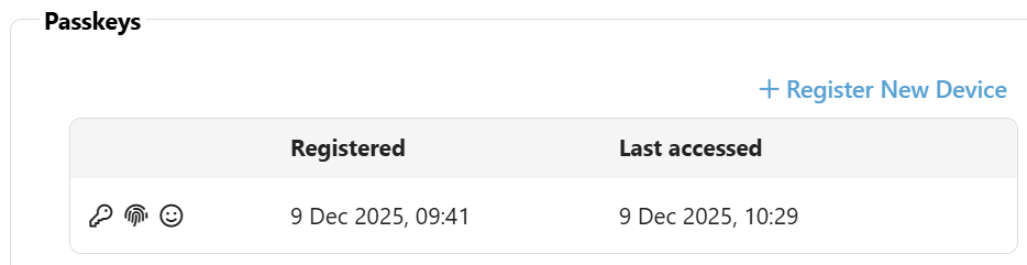 The device will then be registered in Foldr > ME > Security > Passkeys and can be used for sign in.