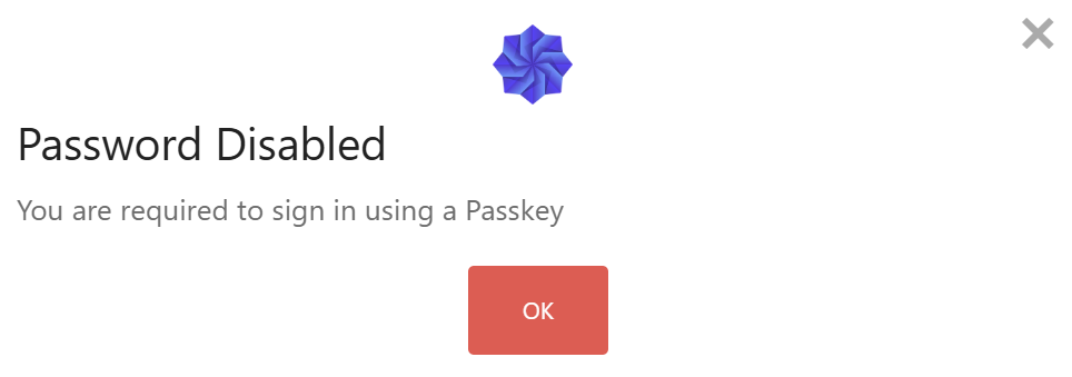 Should a user try to sign into Foldr (web or apps) using their password with the above toggle enabled in their passkey profile, the following warning dialog is shown.