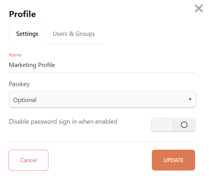 It is possible to force users to sign in only using Passkeys. To do this, enable the toggle to disable password sign in when enabled in the passkey profile in Foldr Settings > Security > Passkeys > Profiles
