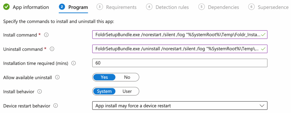 The command above will run the FoldrSetupBundle executable inside the .intunewin installer, ensure that the client does not restart and will perform a silent installation.  The installation will be logged to C:\Windows\Temp.  The additional arguments are explained below: