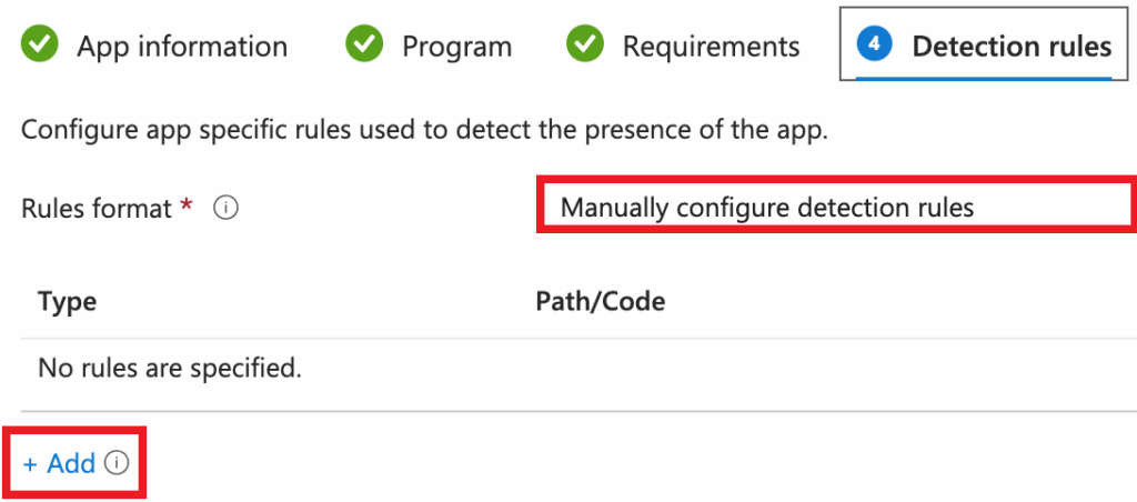 17.  In the Detection rules tab, select to Manually configure detection rules and click + Add