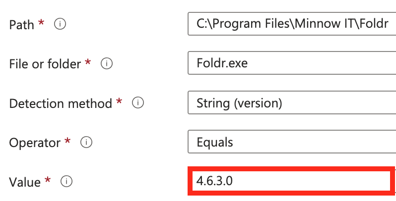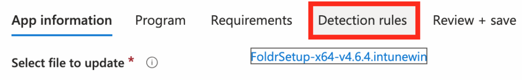 Upgrading the app with the .intunewin package is simply a case of editing the Foldr win32 app, supplying the new .intunewin installer package and adjusting the detection rule value at step 18 to check for the four-character value that matches the new version being deployed.  The steps to do this are shown below: