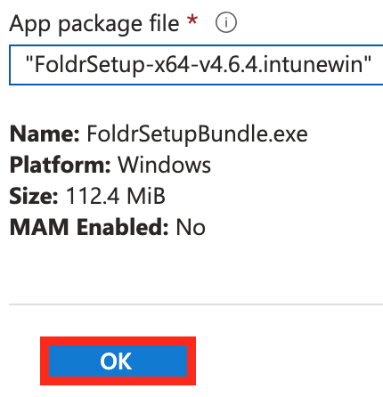 6.  Browse to the new FoldrSetup-x.intunewin file that you wish to deploy.  Then click confirm the selection.