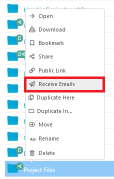 Users that have been granted the Receive Email and Share permission will now see the Inbox tab in the Sharing dialog in the web interface and Receive emails in the web apps context menu.