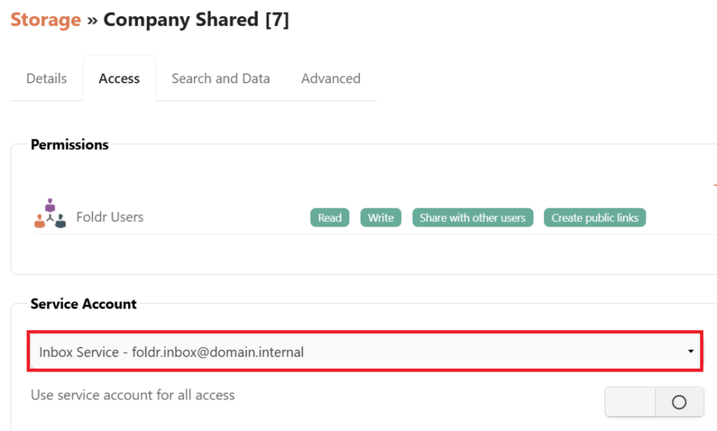 Then, in Foldr Settings > Files & Storage > Edit Storage > Access tab > Service account, select the service account