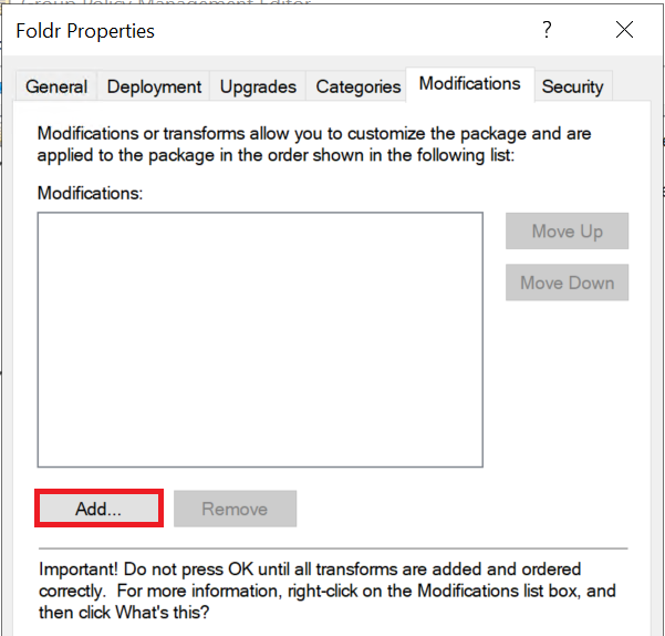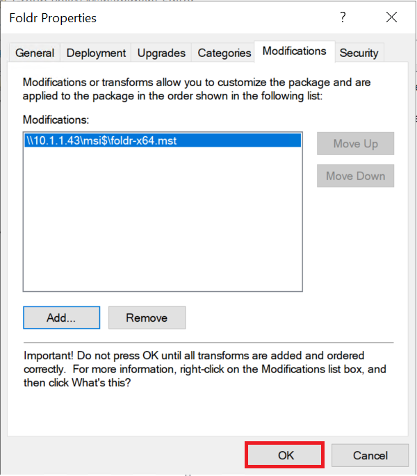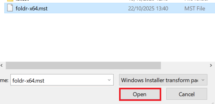 To apply the MST file during installation, first download and copy the MST file to a shared location (where the Foldr MSIs is hosted is ideal)